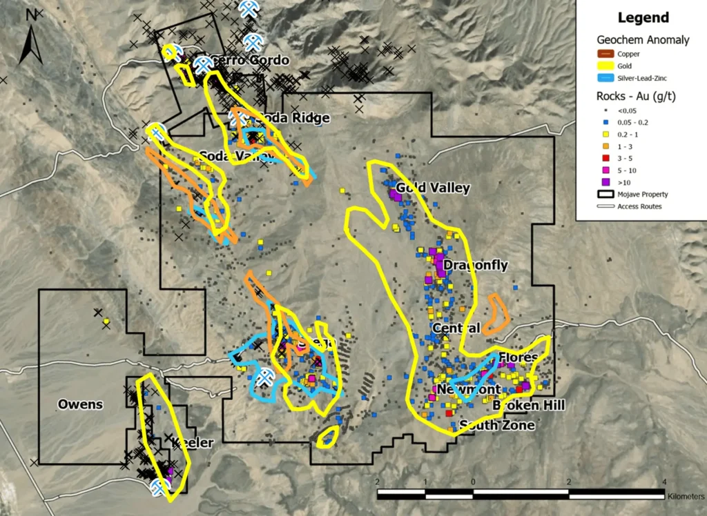 Mojave hosts a range of mineralization likely related to a buried pluton identified by VTEM and aeromagnetic geophysics. The pluton is believed to be the heat engine responsible for distal sediment-hosted oxide gold occurrences, to proximal sediment-hosted base metal veins, polymetallic skarn, and potential copper-gold porphyry occurrences on the west side of the property.